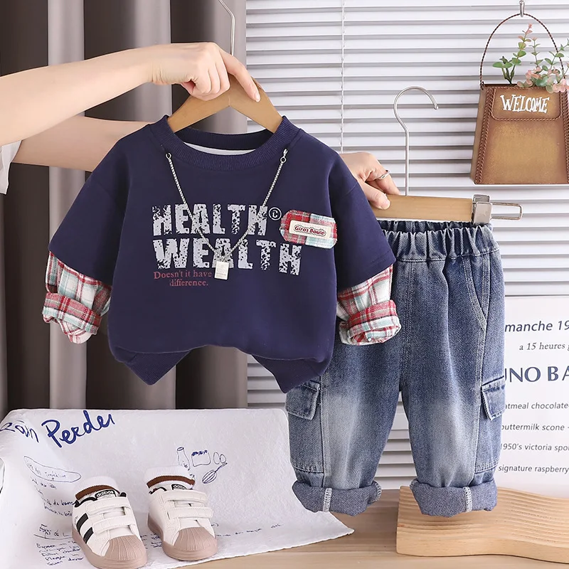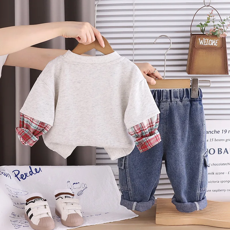 2026 Children Clothes Spring Autumn Kids Boutique Clothing Sets Letter Print Plaid Long Sleeve Top Denim Pants 2pcs Boy Outfits